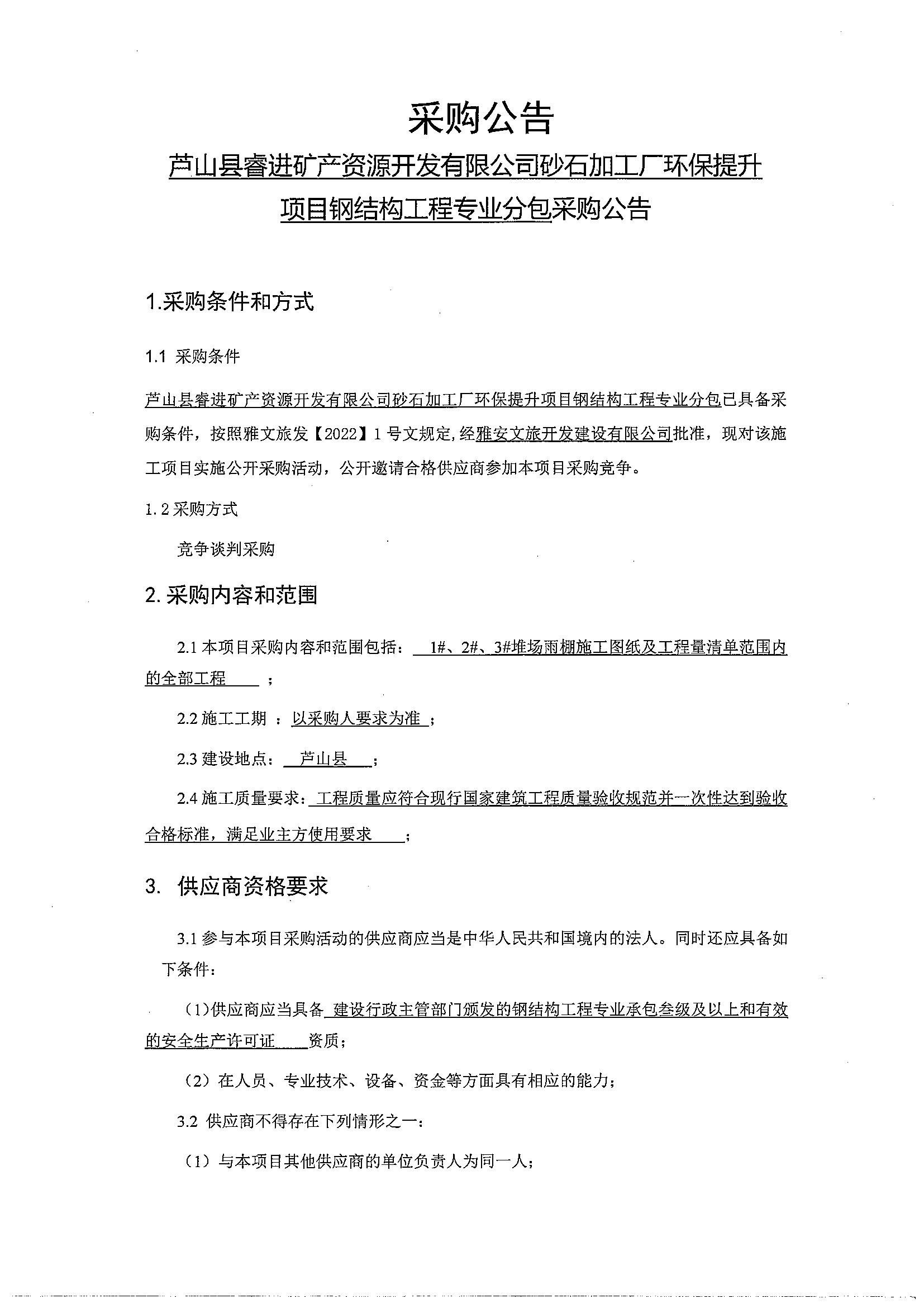 蘆山縣睿進(jìn)礦產(chǎn)資源開發(fā)有限公司砂石加工廠環(huán)保提升 項(xiàng)目鋼結(jié)構(gòu)工程專業(yè)分包采購公告